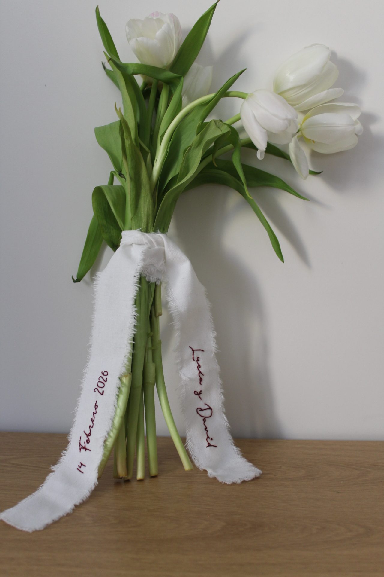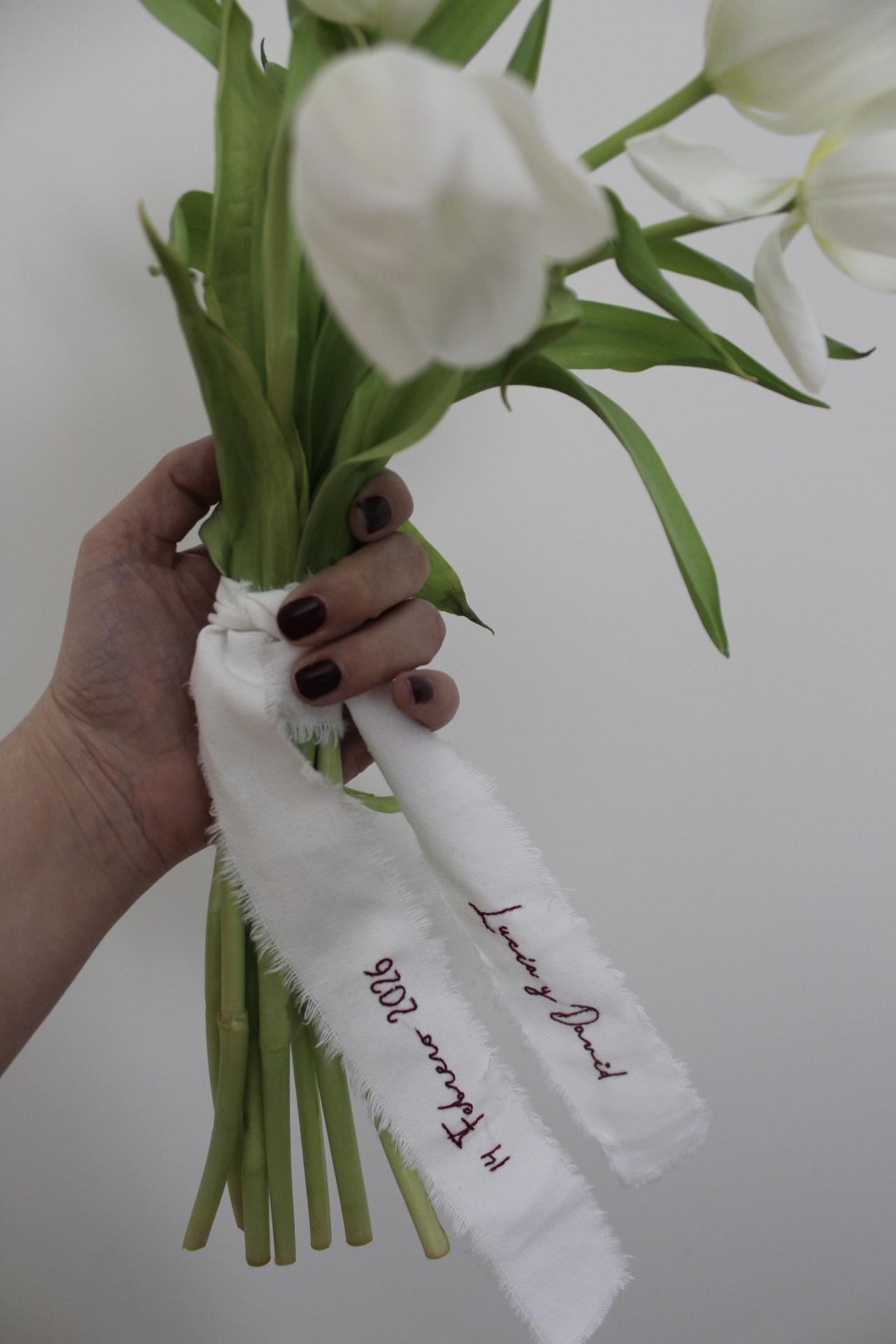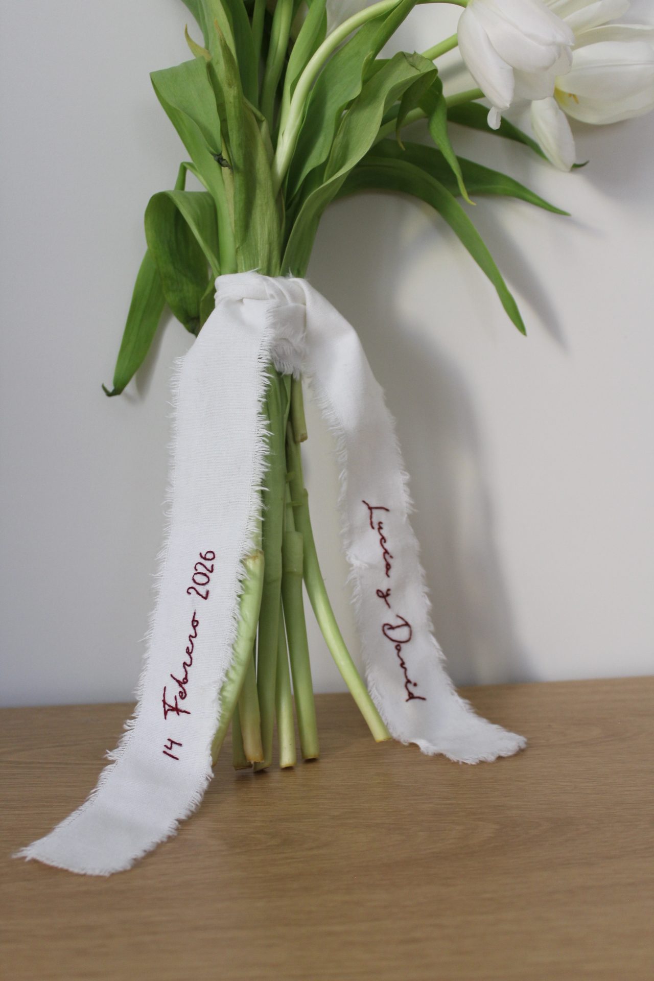 Cinta para ramo bordada a mano. Ideal para dar un toque personal a tu ramo.