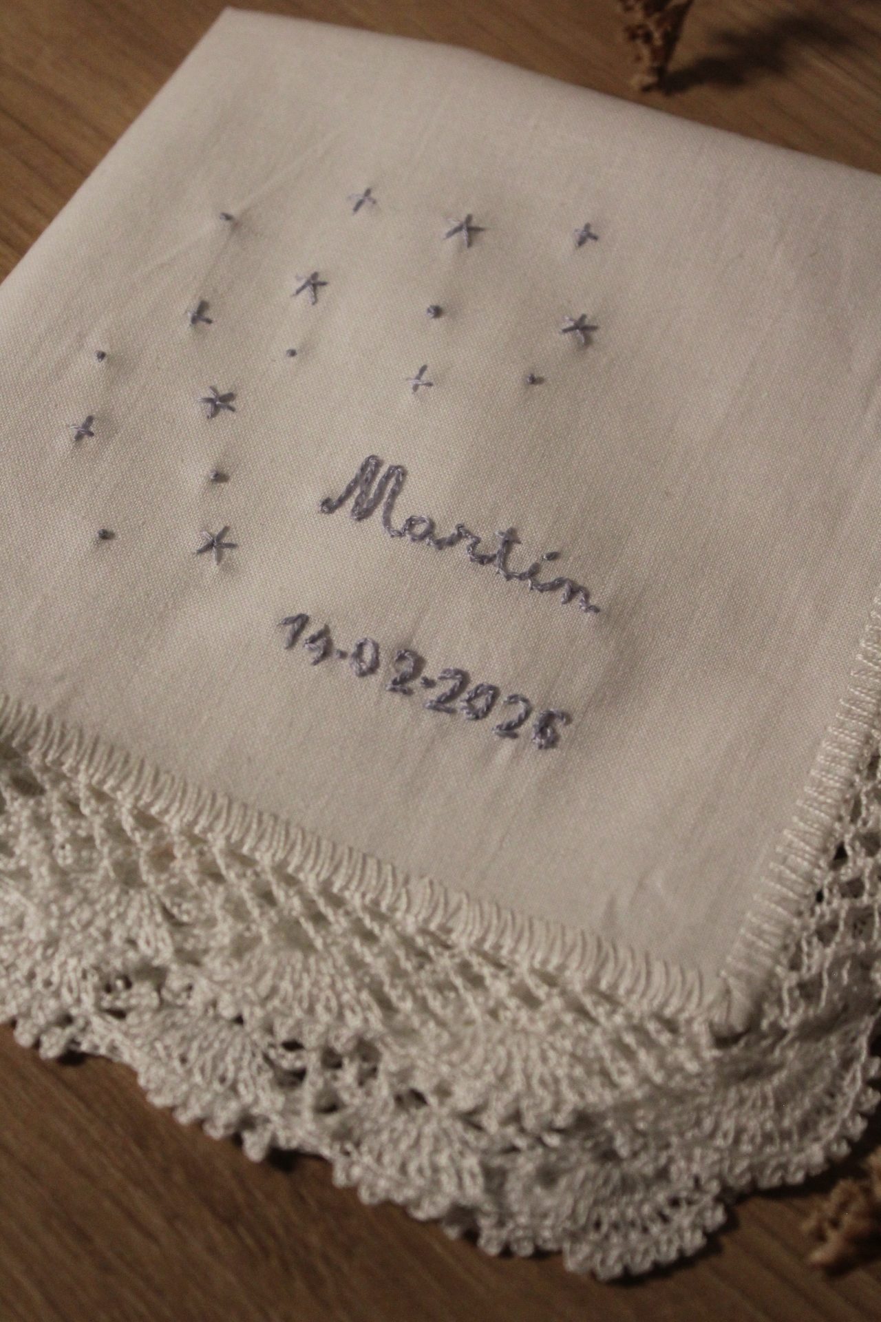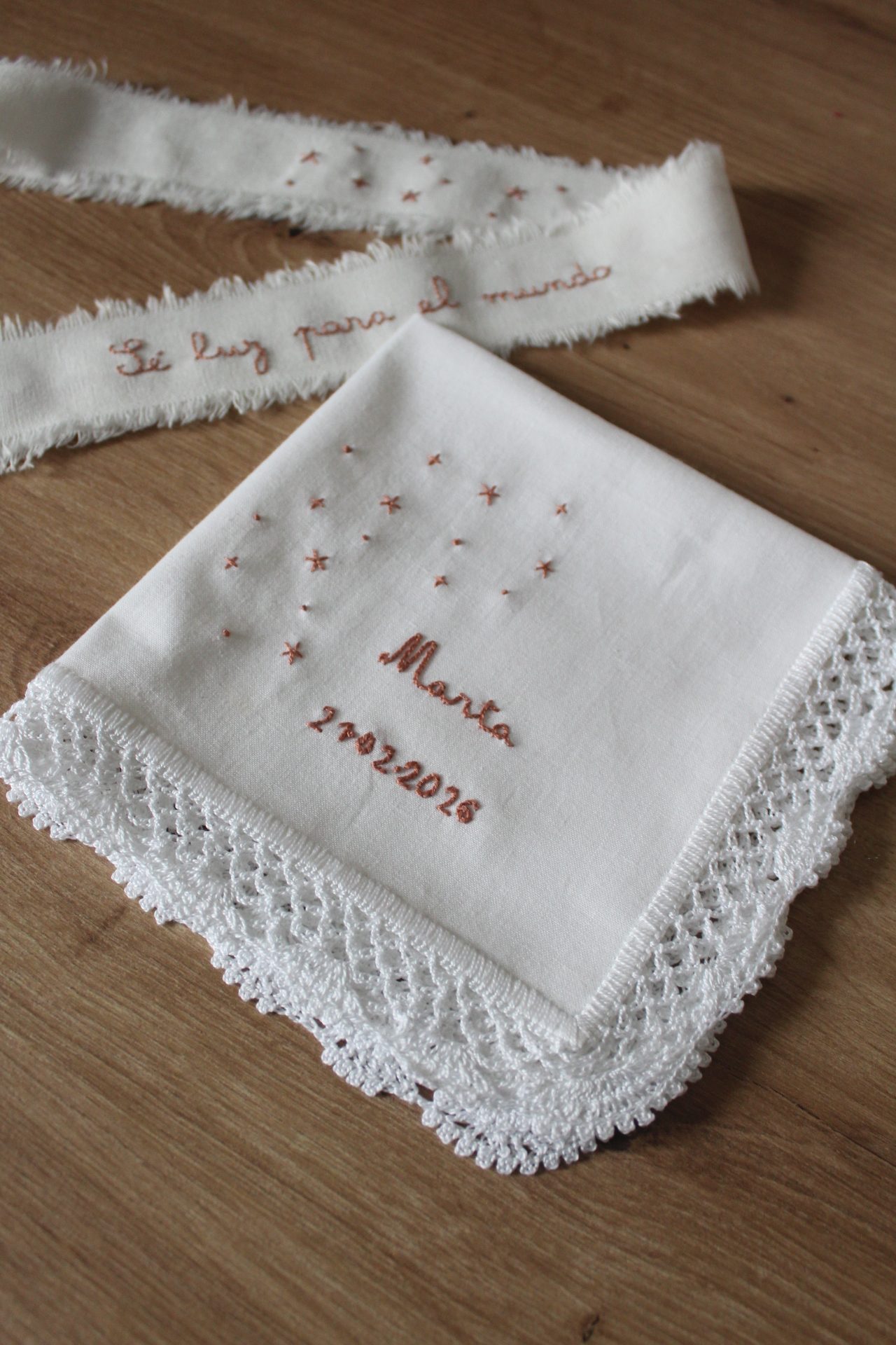 Pañuelo de algodón con encaje hecho a mano con diseño de estrellitas bordadas.